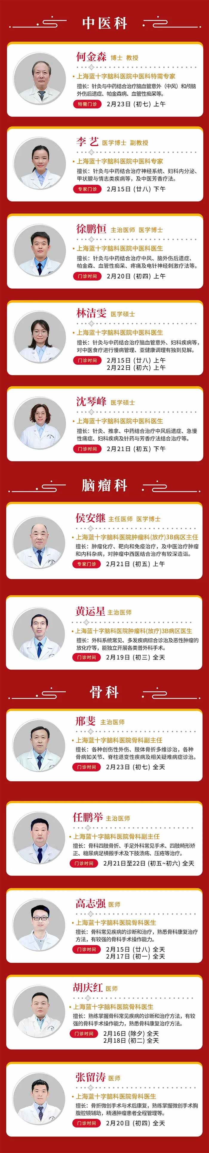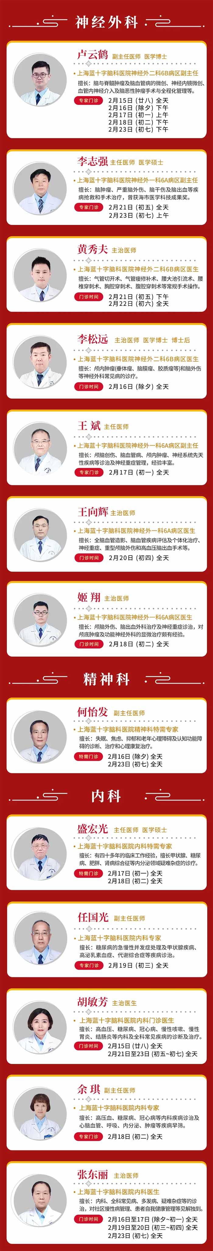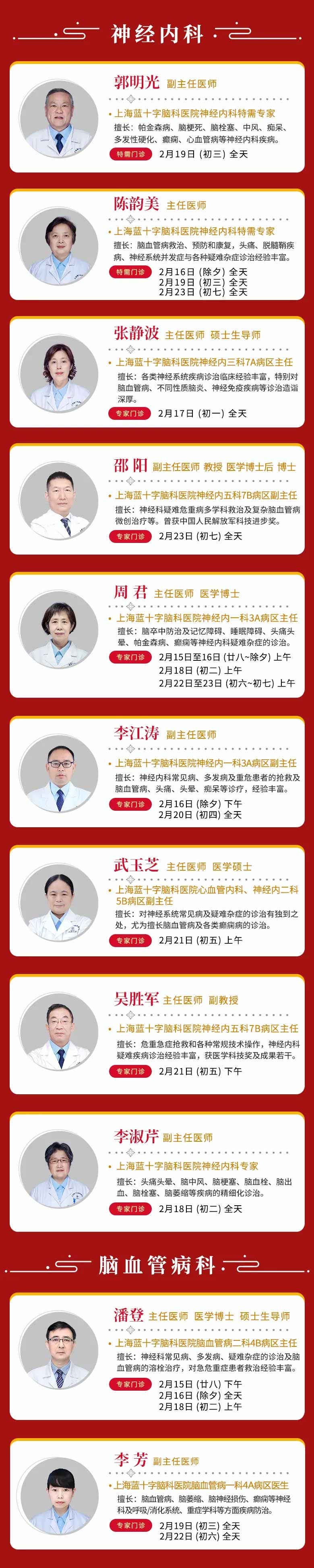 无论何时,您的健康都是我们最深的牵挂!为节约您的宝贵时间,减少等候,建议您提前通过上海蓝十字脑科医院微信公众号在线预约,或拨打暖心服务热线 021-64879999进行咨询与挂号。提前规划,错峰就诊,让关爱更高效,让团圆更安心。(注:以上门诊信息仅供参考,请以实际出诊情况为准)