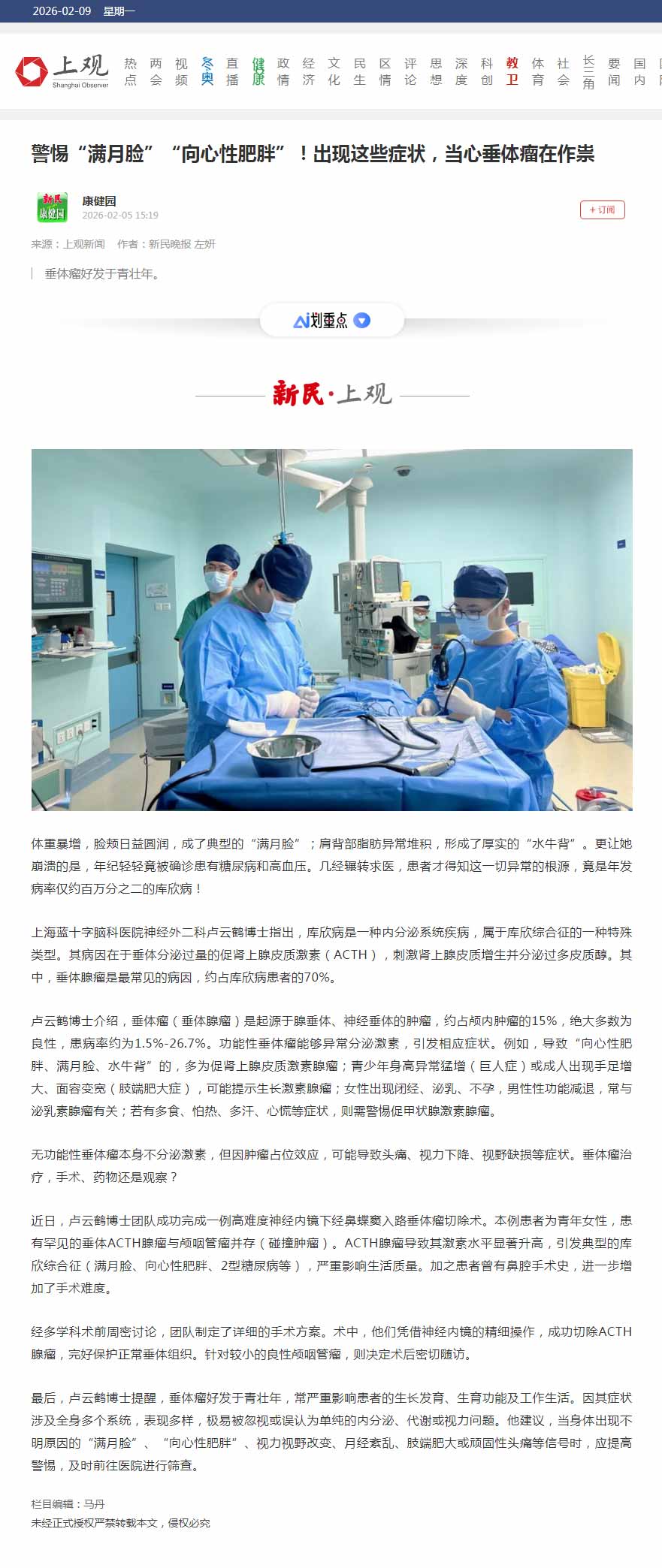 上观新闻 | 警惕“满月脸”“向心性肥胖”!出现这些症状,当心垂体瘤在作祟