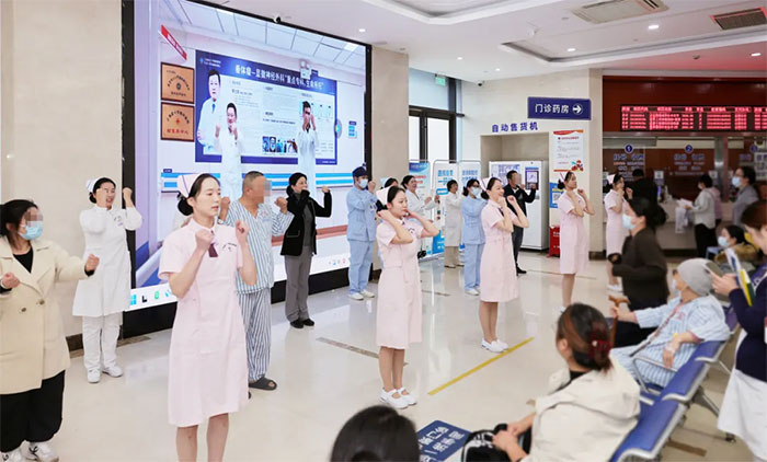 为进一步增强科普效果,活动还设置视频展播与互动教学环节。上海蓝十字脑科医院5A神经内二科李兰馨护士长团队带来曾获2024年闵行区护理科普讲解大赛三等奖的科普作品《动起来,不要被“栓”住》。该作品以真实案例为切入点,通过生动视频画面与通俗解说,将专业血栓知识转化为易懂的生活常识。随后,李兰馨护士长团队现场演示“预防深静脉血栓操”,并带领观众跟练。现场气氛活跃,不少患者反馈:“动作简单实用,在床上就能练习,非常方便!”