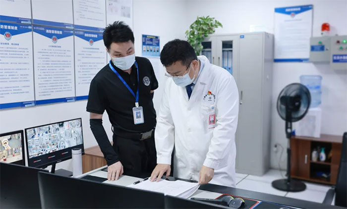 在消控室,朱敏书记和项耀钧院长仔细查阅安保人员交接班记录,详细询问并检查安全管理责任制度的落实,尤其是节日期间安保消防力量的安排部署情况。院领导再三叮嘱相关负责人,要严格执行关键岗位24小时值班制度,确保人员在岗在位;严格执行信息报告和突发事件应急处置预案,遇到紧急情况必须及时请示报告,确保节日期间医院安保消防工作平稳有序。