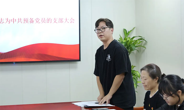 卢盟杰同志作表态发言,他表示感谢组织的信任和大家的认可,将以此为新的起点,不断加强理论学习,提高党性修养,严格以党员标准要求自己,不辜负党组织的信任与培养。