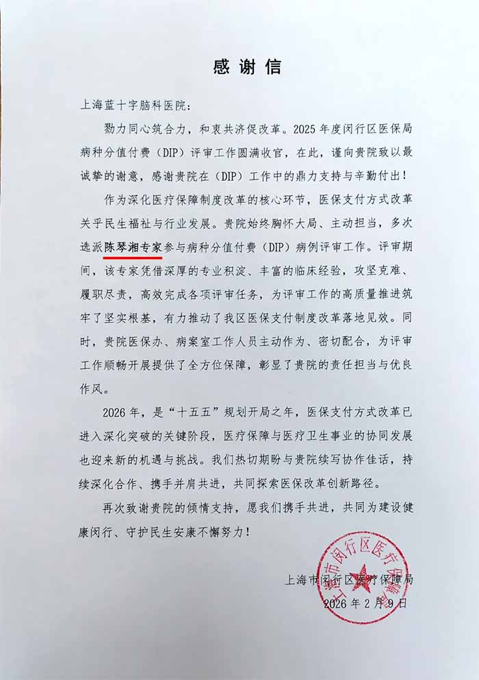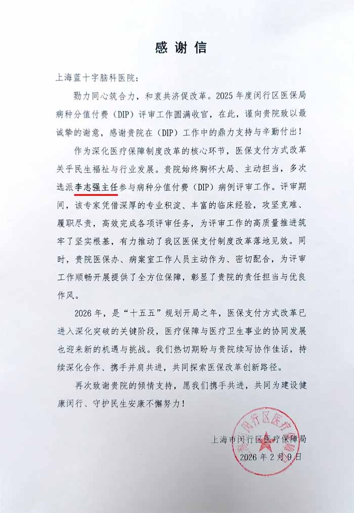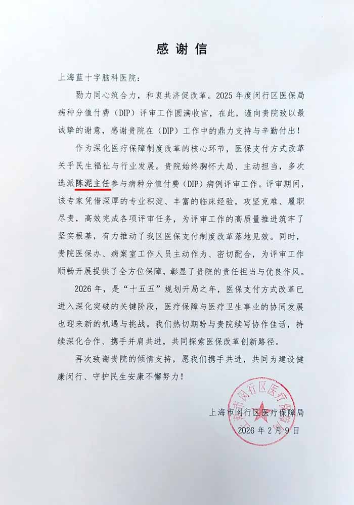 闵行区医保局在感谢信中表示,2026年是“十五五”规划开局之年,医保支付方式改革已进入深化突破的关键阶段,期待与上海蓝十字脑科医院持续深化协作、携手并进,共同探索医保改革创新路径,推动医疗保障与医疗卫生事业协同发展。